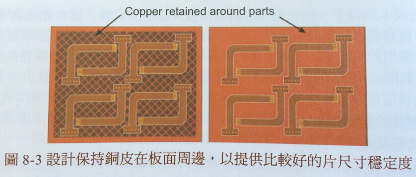 如前所述,使用軟板的其中一個目的是為了要降低產(chǎn)品重量,這也會影響到是否留下殘銅的判斷。如果降低最終產(chǎn)品重量是關鍵,則有需要去除一點銅,這同時也會降低尺寸穩(wěn)定度。另外一個維持銅的原因是要降低銅蝕刻數(shù)量,這樣制程減少了化學品用量而比較具有環(huán)境友善性。圖8-3所示,為典型軟板邊緣銅面維持的設計范例。