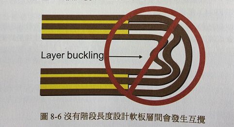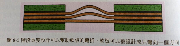 為了容易撓曲多層與軟硬結(jié)合板設(shè)計(jì),會(huì)使用階段式增加長(zhǎng)度的設(shè)計(jì)。這是在各軟板層上逐步朝彎折外轉(zhuǎn)增加長(zhǎng)度,如圖8-5所示。