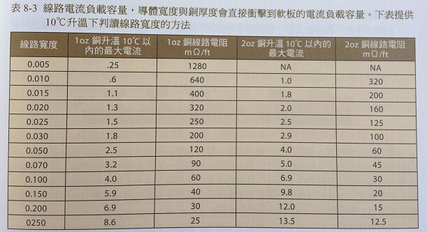 表8-3的內(nèi)容,可以用來判定35um與2um厚度的銅皮,在不同線路寬度下所可以承載的最大電流與電阻。這些是相對(duì)普遍的銅皮厚度被用在多數(shù)軟板制造上,不過18um與更薄的銅皮厚度重要性正持續(xù)增加中。