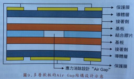 FPC軟板走向多層化,與折疊式手機(jī)的大量設(shè)計(jì)采用有絕對關(guān)系,此外可攜式電子產(chǎn)品強(qiáng)調(diào)重量輕、體積小與功能多,使線路布線配合構(gòu)裝往多層化發(fā)展,F(xiàn)PC軟板多層化原本對軟板而言是會失去可撓曲的特性,但透過在動態(tài)區(qū)域作應(yīng)力消除設(shè)計(jì)可維持FPC軟板動態(tài)應(yīng)用之需求并符合高密度的多層線路設(shè)計(jì),一般稱此設(shè)計(jì)為”air gap”,側(cè)視結(jié)構(gòu)圖可參考下圖9。