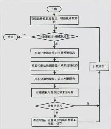 異形線路屬于FPC上的不規(guī)則形狀,一般包括LED燈、S型圓等;由于與外設(shè)形狀相關(guān),其布線一般與待檢FPC的樣式結(jié)構(gòu)有關(guān)。針對這類線路,考慮模板匹配方式實(shí)施檢測:首先通過模板匹配法粗步定位出各個(gè)異形線路在整塊FPC上的位姿,獲取異形線路輪廓;再基于形態(tài)學(xué)理論進(jìn)行缺陷檢測。有關(guān)異形線路的檢測流程見下圖。