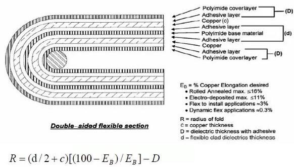 而且在不同的使用場合,同一材料的銅皮變形量取值也不一樣。對于一次性彎曲的的場合,使用折斷臨界狀態(tài)的極限值(對延碾銅,該值為16%)。對于彎曲安裝設(shè)計(jì)情況,使用IPC-MF-150規(guī)定的最小變形值(對延碾銅,該值為10%)。對于動態(tài)柔性應(yīng)用場合,銅皮變形量用0.3%。而對于磁頭應(yīng)用,銅皮變形量用0.1%。通過設(shè)置銅皮允許的變形量,就可以算出彎曲的最小半徑。