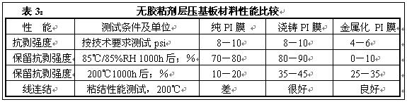 但是它有其局限性,在生產(chǎn)高密度柔性電路板時,層壓覆蓋膜常常面臨著為適應(yīng)器件的安裝需開窗口,形窗口的尺寸精度靠機械加卻受到很大的限制,無法滿足0.50毫米以下的小節(jié)距的技術(shù)要求。第二個方面就是覆蓋層膠粘劑的流動和開窗口對位的精度。既是進行加工卻成本很高。有的消費類的電子產(chǎn)品為了節(jié)省加工成本于是采用涂覆阻焊油墨來取代覆蓋膜,雖然也能起到保導(dǎo)線的作用,然而它不具有良好的機械特性,更不適用動態(tài)撓性方面的應(yīng)用,因此它的應(yīng)用受到很大的限制。為此,為解決它于是出現(xiàn)液態(tài)感光型覆蓋層,不但能順利地解決加工精度問題,而成本降較低,并簡化了生產(chǎn)工藝。只要采用普通型標(biāo)準(zhǔn)的UV曝光機、水溶性顯影液顯影、然后加熱進行后固化的工藝,省去了常規(guī)采用層壓工序。目前已經(jīng)研制與開發(fā)很多種新材料與新技術(shù),有的已應(yīng)用在批量生產(chǎn)上發(fā)揮了重要的作用。見表3: