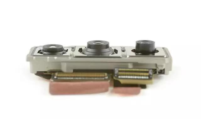 拆下主板屏蔽層之后可以看到華為P20 Pro最強悍的三攝像頭模組了,此次華為將三顆攝像頭都設計成同一個模塊,并且還是緊挨著主板上的,而閃光燈也是被后置三攝給拖拽著。