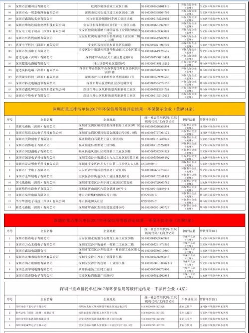 6月7日,深圳市環(huán)境監(jiān)察支隊在深圳人居環(huán)境網(wǎng)上公布了深圳市重點排污單位2017年度環(huán)保信用等級初評結(jié)果,被評定為環(huán)保誠信企業(yè)(綠牌)15家,環(huán)保良好企業(yè)(藍(lán)牌)830家,環(huán)保警示企業(yè)(黃牌)151家,環(huán)保不良企業(yè)(紅牌)65家,不參評(含搬遷、關(guān)停)39家、國控重點排污單位省廳尚未公布初評結(jié)果82家。