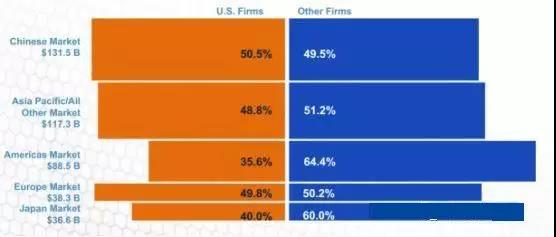2017年,總部位于美國的半導體公司的銷售額占了全球46%的市場,在很多主要的半導體消耗低,美國公司產(chǎn)品的占有率也都在50%左右徘徊。但在全球最大半導體市場之一的日本,美國的市場份額只有40%,不過這與日本一貫以來不怎么接受國外企業(yè)產(chǎn)品的歷史有關。