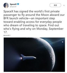 該公司在推特上寫道:“SpaceX與全球首位乘客簽署合同,該游客將搭乘‘大獵鷹’火箭(BFR)繞月飛行。這是向夢想在太空旅行的普通民眾開放的重要一步。”