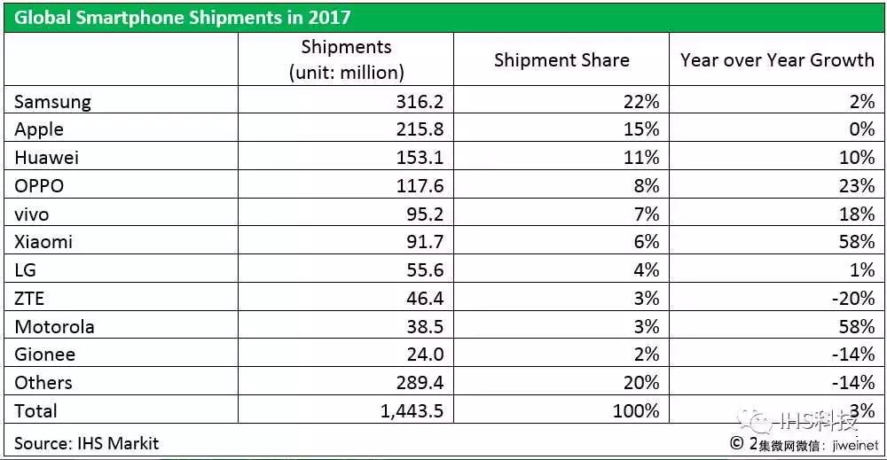 2017年全球智能手機份額Top10