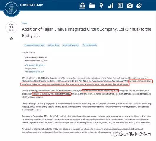 美國商務(wù)部于29日宣布基于國家安全考量,將限制美國廠商與相關(guān)企業(yè)銷售半導(dǎo)體設(shè)備、材料給福建晉華,禁令于10月30日正式生效,后者是中國DRAM存儲技術(shù)陣營的主要廠商。另據(jù)FPC廠了解,路透社10月29日報道,美國商務(wù)部29日稱已將福建晉華集成電路有限公司列入不能從美國企業(yè)采購部件、軟件和技術(shù)產(chǎn)品的“實體名單”。