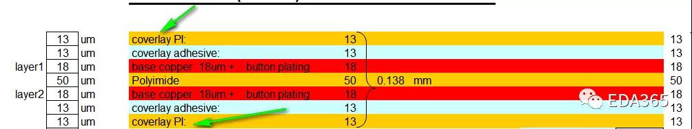 FPC覆蓋膜稱為CVL,覆蓋膜成分有固化劑、丁酮、稀釋劑、橡膠等,根據(jù)情況不同配方用量各不相同。下圖中箭頭所示的最外面的那一層就是覆蓋膜。