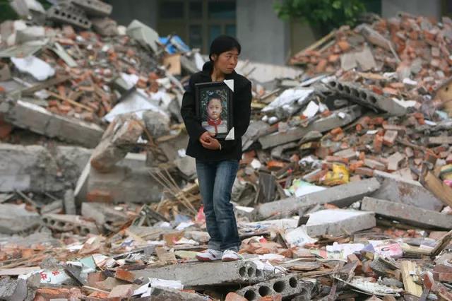 ▲2008年5月22日,母親在廢墟上捧著兒子的遺照。
