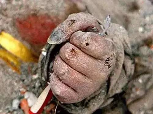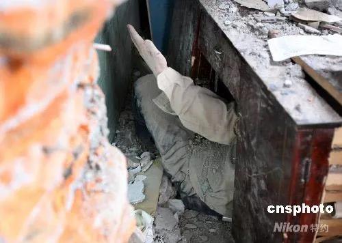 ▲2008年5月16日,被困廢墟72小時(shí)的代軍勇伸出等待救援的手,經(jīng)過23小時(shí)的營救,他死里逃生。