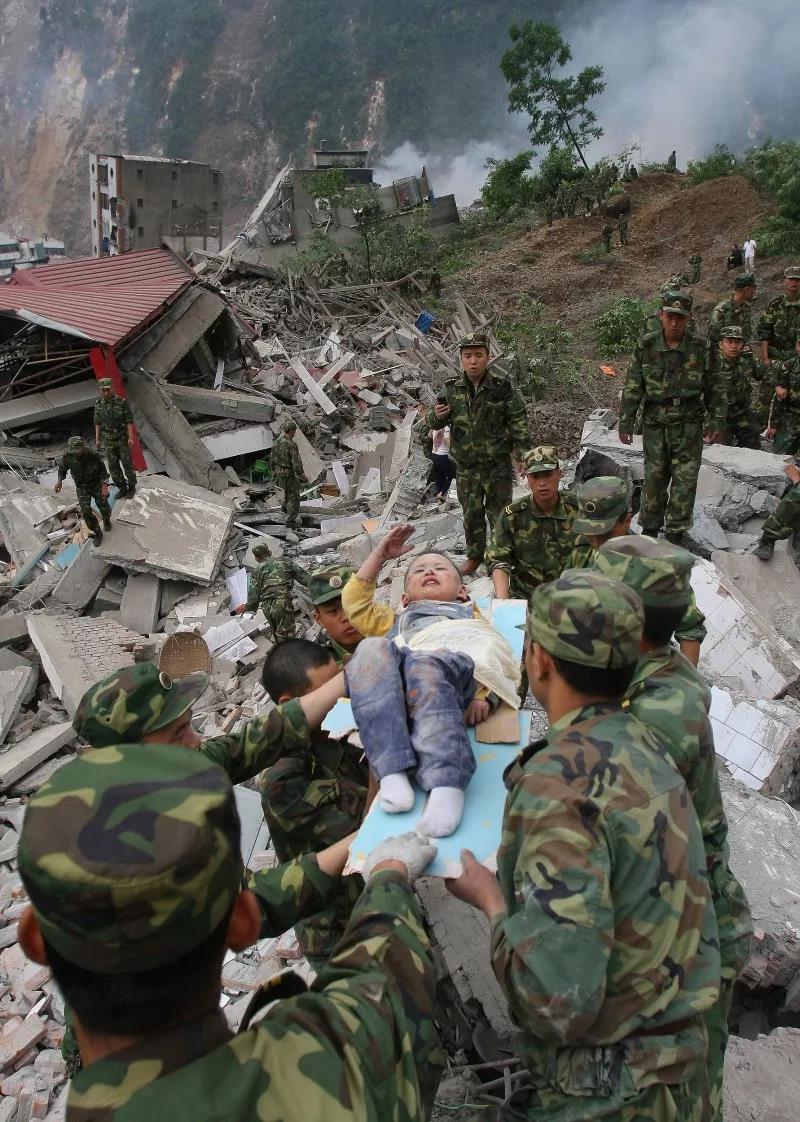 ▲2008年5月15日,綿竹市漢旺東汽中學(xué),災(zāi)難過去80個(gè)小時(shí),男孩終于被救援人員抬出廢墟。他說,“叔叔,我想喝可樂”。