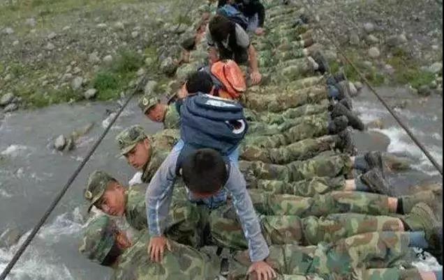 ▲2008年6月,四川省地震災(zāi)區(qū)彭州市湔江河邊,戰(zhàn)士趴在還沒有修完的鐵索橋上,組成臨時(shí)的“人橋”,讓小學(xué)生們從自己的脊背上爬過。