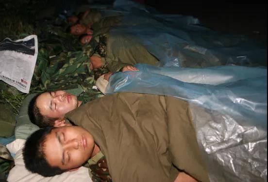 ▲2008年5月15日凌晨,參加抗震救災(zāi)的濟(jì)南軍區(qū)某部戰(zhàn)士在汶川縣映秀鎮(zhèn)街頭休息。