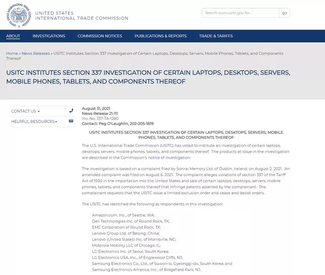 據柔性電路板小編了解,此次調查主要由愛爾蘭 Sonrai Memory 發(fā)起申請,聲稱這些公司正在制造或銷售在海外制造的筆記本電腦、臺式機和手機,這些筆記本電腦、臺式機和手機侵犯了其三項專利。