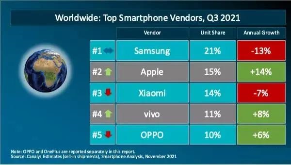 近日市場研究機(jī)構(gòu) Canalys 公布了 2021 年第三季度全球智能手機(jī)出貨的詳細(xì)數(shù)據(jù)。該季度全球共出貨 3.26 億部智能手機(jī),較上一季增長 3%。其中三星以 6940 萬臺的出貨量領(lǐng)先,市場占比 21%;蘋果共出貨 4920 萬臺手機(jī)排名第二,而小米出貨 4400 萬臺排名第三,市場占比 14%。在全球范圍,vivo、OPPO 分別位列第四、第五名。