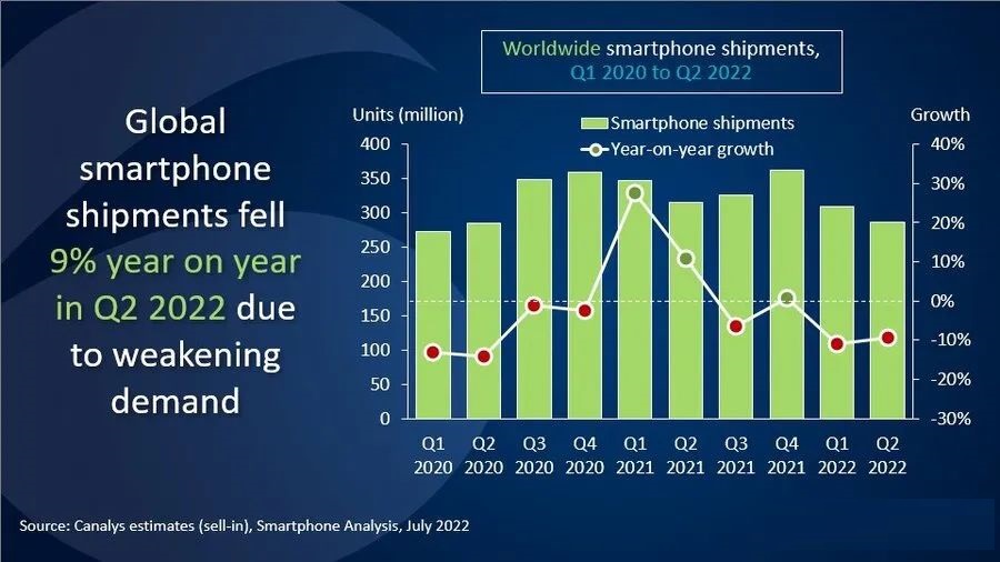據(jù)深聯(lián)電路軟板廠了解,Canalys發(fā)布的新數(shù)據(jù)顯示,2022年二季度全球智能手機出貨量同比下降9%,跌破3億臺,手機出貨量已經(jīng)連續(xù)兩個季度下降。
