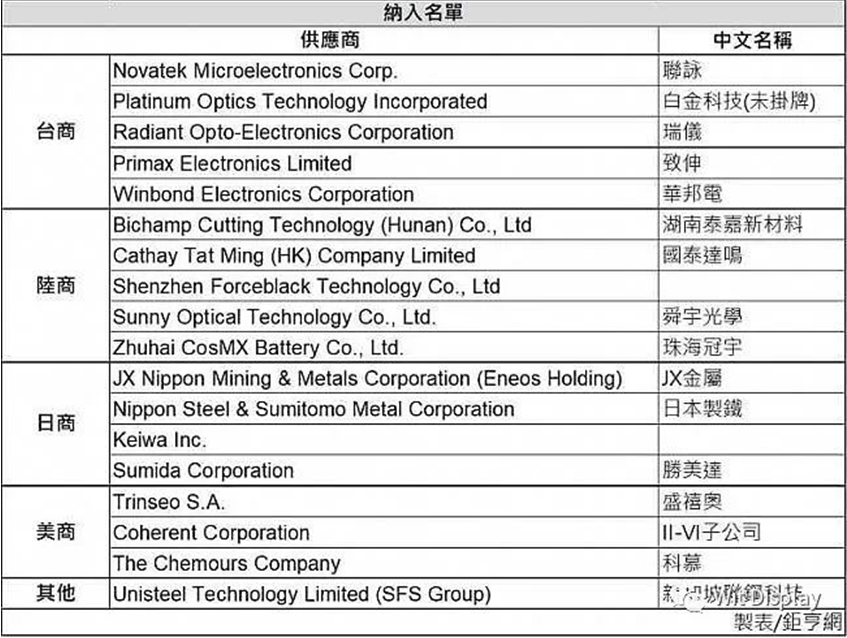 新增進(jìn)入蘋果供應(yīng)鏈的10家中國廠商分別為:湖南泰嘉新材料、國泰達(dá)鳴、舜宇光學(xué)、珠海冠宇及深圳墨力科技(Shenzhen Forceblack Technology),以及來自中國臺灣的聯(lián)詠、華邦電子、瑞儀、致伸及白金科技。值得一提的是,聯(lián)詠、華邦電、白金科技是首度進(jìn)入蘋鏈,瑞儀與致伸則是重回蘋果供應(yīng)鏈。
