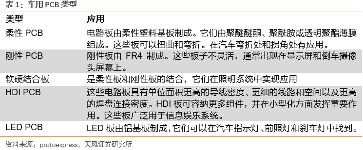 按照類型分,汽車PCB主要類型包含5類,分別是柔性PCB板即FPC、剛性PCB板即RPCB、軟硬結(jié)合板、HDI板以及LED PCB。由于材質(zhì)與特性的不同,各類型PCB擁有不同的應(yīng)用場景。