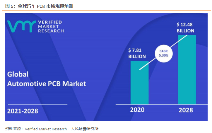 全球汽車PCB市場持續(xù)保持增長。根據(jù)Verified Market Research預(yù)測(cè),2021-2028年汽車PCB市場將保持增長,區(qū)間CAGR為5.30%。市場規(guī)模將由2020年78.1億美金提升至2028年124.8億美金。