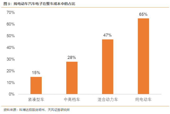新能源汽車新趨勢(shì)帶動(dòng)汽車電子占比進(jìn)一步快速提升。新能源車汽車電子占比更高。汽車電子在整車成本中的占比不盡相同,其中在緊湊型乘用車成本中的占比達(dá)到 15%,中高端乘用車占比達(dá) 28%,混合動(dòng)力乘用車占比達(dá) 47%,純電動(dòng)乘用車占比達(dá) 65%。
