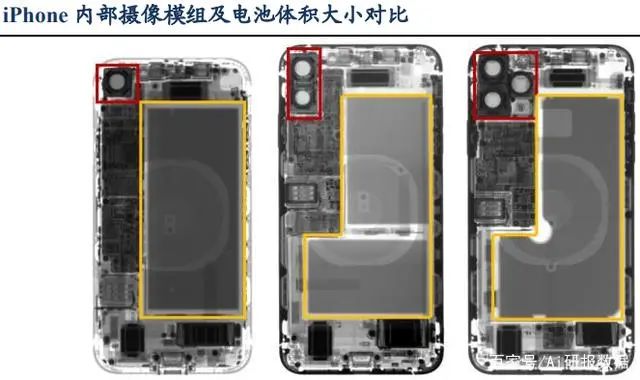 依據(jù)三款iPhone X光圖,由XR、XSMax到最新款11ProMax的對比發(fā)現(xiàn)iPhone11ProMax內(nèi)部的攝像模組體積在變大的同時,其電池大小也在同步變大,留給其他零部件的空間相對減小。