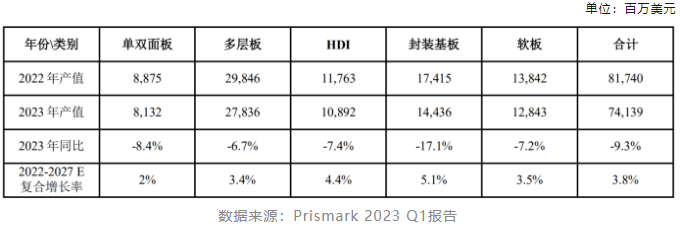 FPC廠了解到,受智能手機(jī)、PC等傳統(tǒng)消費(fèi)電子需求疲軟等因素影響,2022年開(kāi)始PCB整體需求轉(zhuǎn)弱。根據(jù)Prismark 2023年第一季度報(bào)告,2023年全球PCB產(chǎn)業(yè)以美元計(jì)價(jià)的產(chǎn)值將同比降低9.3%,較去年第四季度的預(yù)測(cè)下滑5.2個(gè)百分點(diǎn)。