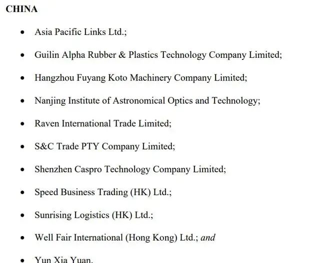 軟板廠了解,28 個實體中,10 個實體和1 名自然人來自中國、俄羅斯和巴基斯坦分別有5 個、芬蘭3 個、阿曼2 個、德國和阿聯(lián)酋各1 個。具體涉及中企名單包括中國科學院國家天文臺南京天文光學技術研究所、杭州富陽科拓機械有限公司和桂林阿爾法橡塑科技有限公司等。