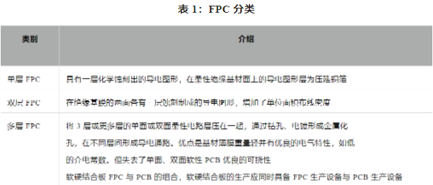 柔性電路板(FPC,F(xiàn)lexible Printed Circuit)是以柔性覆銅板為基材制成的一種電路板,作為信號傳輸?shù)拿浇閼糜陔娮赢a品的連接,具備配線組裝密度高、彎折性好、輕量化、工藝靈活等特點。FPC一般可分為單層 FPC、雙層 FPC、多層 FPC 和軟硬結合版。