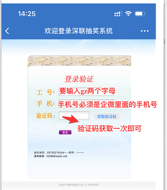 進(jìn)入抽獎(jiǎng)頁面后,填寫自己的工號(hào)和手機(jī)號(hào),并獲取驗(yàn)證碼,填寫完驗(yàn)證碼后進(jìn)入大轉(zhuǎn)盤抽大獎(jiǎng)?。ㄗ⒁猓憾绦膨?yàn)證碼保留一天,若想再次登錄抽獎(jiǎng)頁面,直接用第一次獲取的驗(yàn)證碼)