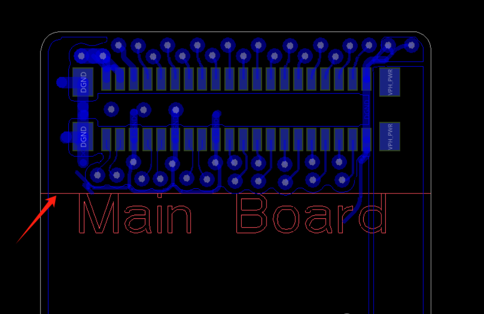 FPC設(shè)計(jì)中,對(duì)彎折區(qū)的要求很高,第一點(diǎn)就是彎折區(qū)內(nèi)不能打孔,打孔會(huì)使彎折區(qū)銅硬度變大,影響彎折的效果和降低FPC壽命。如下圖所示,箭頭所指線以下為彎折區(qū),BTB連接器的換層走線孔必須避開彎折區(qū),不能在彎折區(qū)打孔。