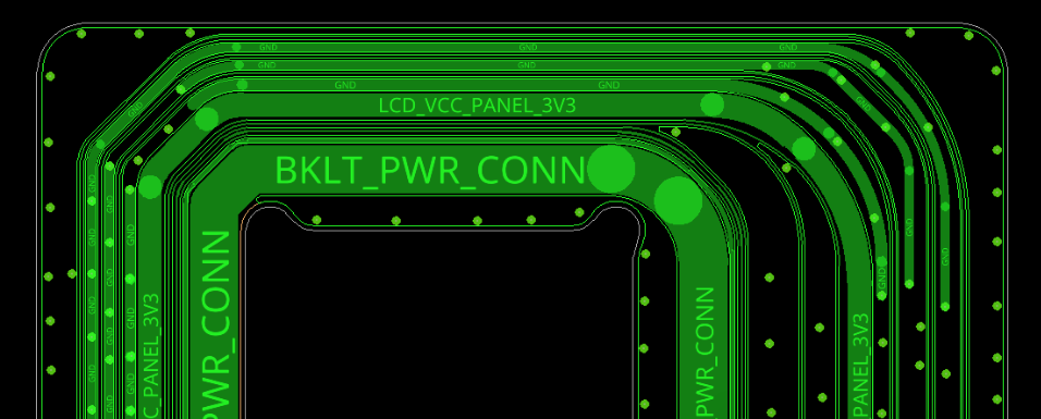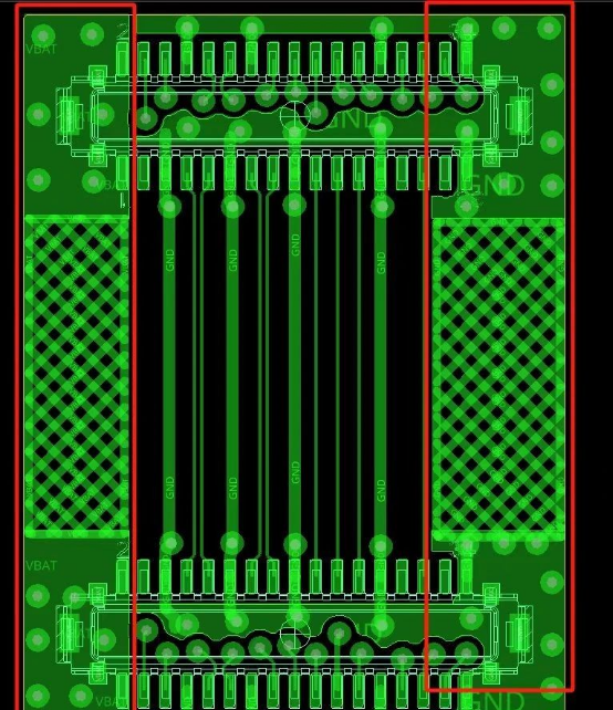 第三點(diǎn)就是要使用網(wǎng)格狀鋪銅,網(wǎng)格狀銅可以保存更好的彎折效果,如下圖所示,上下兩個(gè)BTB連接器加強(qiáng)部分鋪全銅,中間彎折部分加網(wǎng)格狀鋪銅。