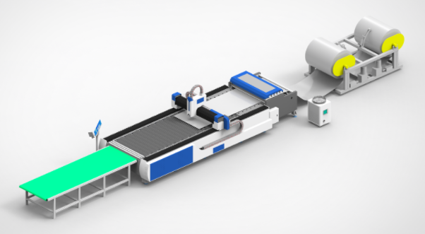 激光切割自動旋轉機床(俗稱;全自動卷料光纖激光切割機廠家,提供旋轉平臺光纖激光切割機,全自動卷料送料激光切割機,卷料激光切割生產(chǎn)線 滾動臺面光纖激光切割機,自動上料激光切割機,風管激光切割機自動上料下料,通風管道風管激光切割生產(chǎn)線,風管激光開料機,通風管道光纖激光下料機,卷材全自動激光切割機送料設備):包括卷料料架,校平裝置,激光機床床體、接料平臺,自動刀條旋轉組件;工作原理:首次入料卷料通過校平機校平后進入激光切割平臺進行切割,切割完成后校平機自動送料,旋轉平臺自動把切割完成的配件輸送到接料平臺,校平機送料完成后系統(tǒng)運行切割第二張排版圖料件,同時可進行切好料件的編號收集工作,以此往復工作大大提高整體加工速度及效率。